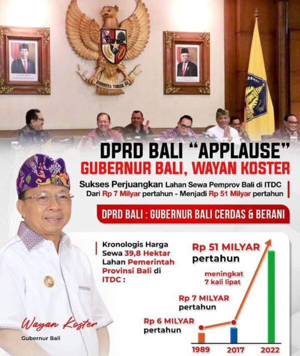 Renon, Surya Indonesia – Aset Pemprov Bali di kawasan ITDC nusa dua kawasan elit Pariwisata seluas 39,8 hektar disewakan sangat murah yakni 7 Miliar dan pembayaranpun molor, seperti sewa untuk tahun 2017 baru bayar di tahun 2021, bahkan parahnya, aset Pemprov Bali di kawasan ITDC itu dijadikan jaminan bank, dengan kredit yang didapat sebesar Rp 2,5 triliun.
