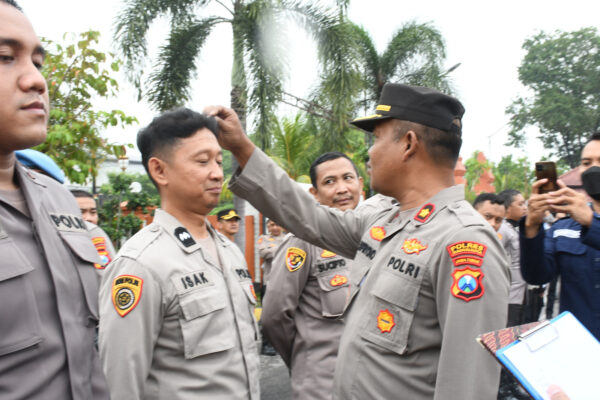 Wakapolres berjalan di antara barisan personil cek satu persatu personil mulai dari kerapihan rambut jambang dan gampol.