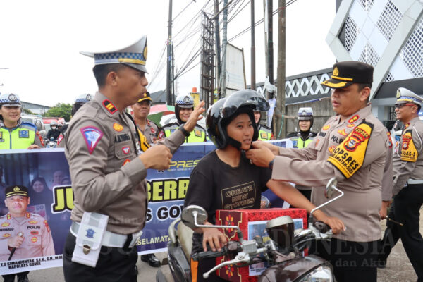 Gowa, Surya Indonesia.net – Operasi keselamatan lalu lintas 2023 di wilayah Polres Gowa saat ini telah berjalan dalam kegiatan tersebut, Kapolres Gowa AKBP Reonald T.S Simanjuntak , S.IK., S.H., M.M., M.I.K turun langsung membagikan helm ke para pengendara yang melintas di Jalan Poros Pallangga Kabupaten Gowa, Jumat (9/2).