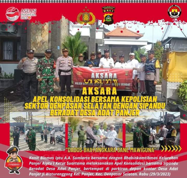 Denpasar – Surya Indonesia.net Sebagai tindak lanjut program unggulan Kapolresta Denpasar Kombes Pol. Bambang Yugo Pamungkas, S.H., S.I.K.,M.Si. yakni AKSARA, personil Polsek Densel dipimpin Kanit Binmas Iptu A.A. Ketut Sumiarta bersama dengan Bhabinkamtibmas Kelurahan Panjer Aiptu I Ketut Suartama dan Babinsa melaksanakan Apel Konsolidasi bersama Sipandu Beradat Desa Adat Panjer, bertempat di parkiran depan kantor Desa Adat Panjer Jl.Waturenggong Kel. Panjer, Kec. Denpasar Selatan. Rabu (29/3/2023)