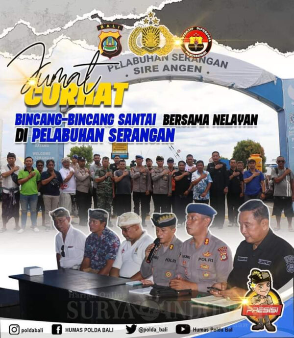 Polda Bali, Surya Indonesia.net Kepolisian Daerah Bali beserta jajarannya kembali melaksanakan program Jumat Curhat, program kali ini dilaksanakan oleh satuan Binmas yang bertempat di pelabuhan serangan,Jumat (31/3/2023).