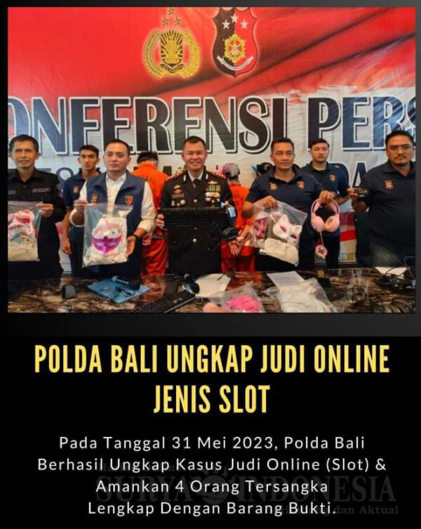 Kombes Pol. Satake Bayu dihadapan awak media menyampaikan, memang benar tanggal 31 Mei 2023, Polda Bali telah berhasil mengungkap kasus judi online jenis slot dan mengamankan 4 orang tersangka, di empat lokasi yang berbeda dan lengkap dengan barang bukti.