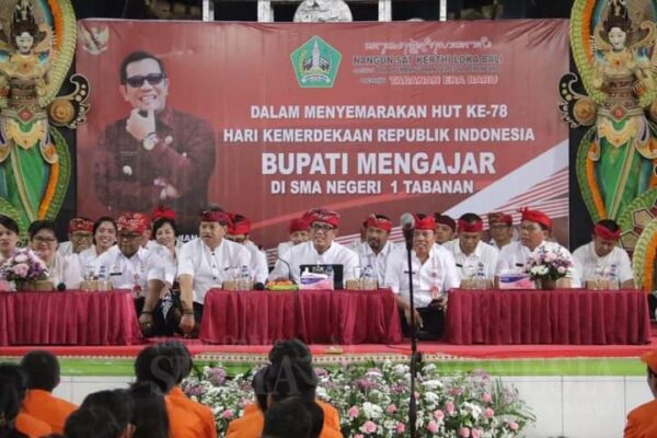 Tabanan , Surya Indonesia.net – Sebagai public figur sekaligus orang nomor satu di Kabupaten Tabanan, Bupati Tabanan Dr. Komang Gede Sanjaya, SE., MM, selalu menjadi trend setter, salah satunya bagi kalangan pelajar. Karenanya, dalam momen peringatan HUT Kemerdekaan RI ke-78 dan HUT Smasta ke-62 ini, Bupati Sanjaya berkesempatan bertatap muka langsung serta menerapkan program “Bupati Mengajar” yang menyasar Siswa-siswi di SMA Negeri 1 Tabanan, bertempat di Aula Sekolah setempat, Sabtu(5/8) pagi.