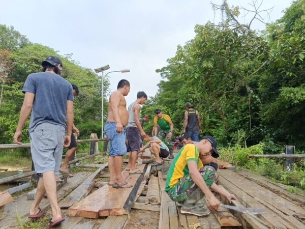 SANGGAU , Surya Indonesia.net – Wujud nyata kepedulian TNI kepada masyarakat ditunjukkan oleh personel Satgas Pamtas Yonarmed 10 Kostrad Pos Sei Tekam dengan membantu warga desa binaan membangun kembali jembatan yang sudah rapuh dan dapat membahayakan bagi warga yang melintas di Desa Sei Tekam Kecamatan Sekayam perbatasan Indonesia-Malaysia wilayah Sanggau Kalimantan Barat.