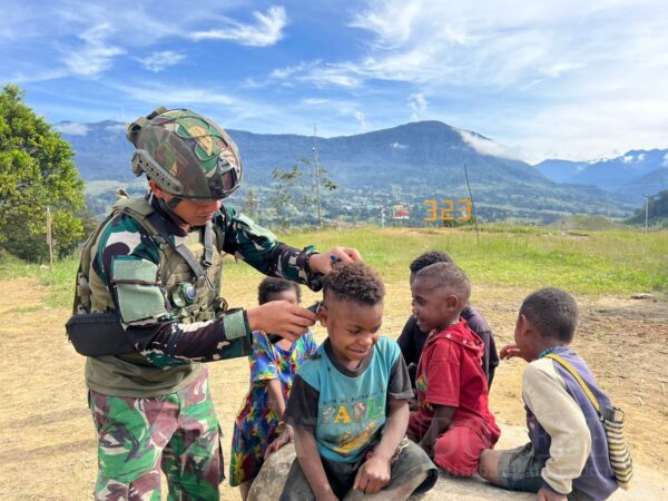 PAPUA TENGAH , SURYA INDONESIA.net Sebagai bentuk peduli keberhasilan kepada anak anak di distrik Gome, Satgas mobile Yonif 323 Buaya Putih Pos Gome bantu pangkas rambut anak-anak secara gratis di Kp. Gome, Distrik Gome, Kab. Puncak, Papua Tengah.