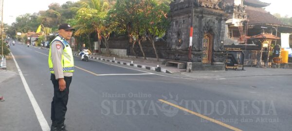 Personil Polsek Padangbai di strongpoint wilayah Desa Padangbai untuk atur lalin pagi.