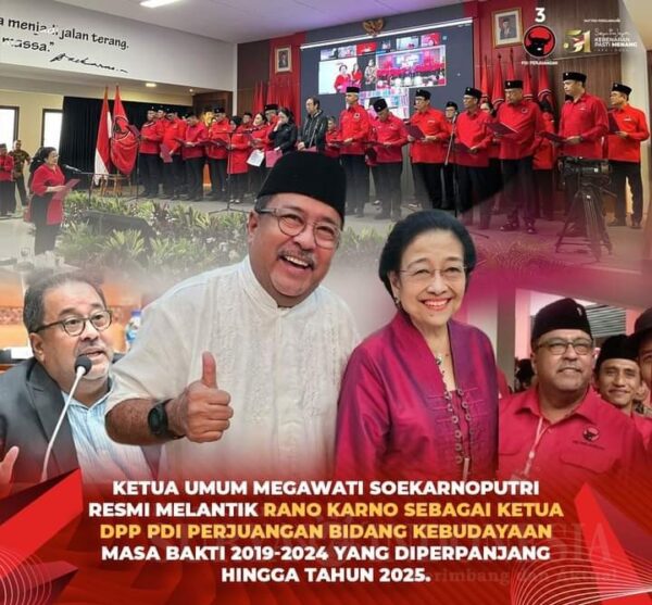 Jakarta, Surya Indonesia.net – Ketua Umum Megawati Soekarnoputri resmi melantik Rano Karno sebagai Ketua DPP PDI Perjuangan Bidang Kebudayaan masa bakti 2019-2024 yang diperpanjang hingga tahun 2025.