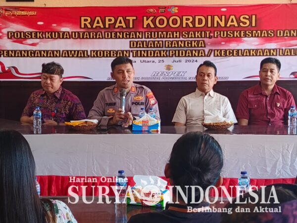 Kuta Utara , Surya Indonesia.net – Kepala Kepolisian Sektor Kuta Utara AKP Yusuf Dwi Admodjo S.I.K.,M.H mengundang pihak Rumah Sakit, Puskesmas, dan Klinik yang ada di Daerah Hukum Polsek Kuta Utara dalam rangka Rapat Koordinasi terkait penanganan awal korban tindak pidana atau kecelakaan lalu lintas bertempat di ruangan Aula Polsek Kuta Utara jalan Batu Bolong no 30.A, Banjar Pipitan, Desa Canggu, Kecamatan Kuta Utara, Kabupaten Badung, Bali. Kamis (25/7) pukul 10.00 Wita.