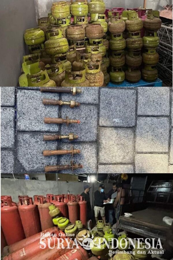 Didalam Gudang ditemukan juga barang bukti beberapa tabung gas LPG 50 kg dengan posisi tidur yang sedang diisi/dioplos dengan Gas LPG subsidi 3kg, serta barang bukti lainnya berupa :