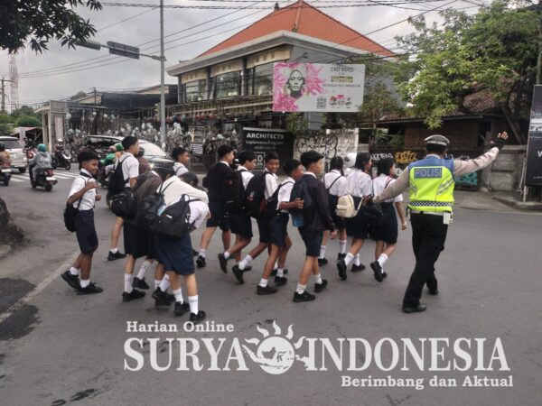 Tampak sore itu personel unit Lalu Lintas Polsek Kuta Utara Aiptu Sugiarta sedang melakukan pengaturan arus lalu lintas di Simpang Lio Kelurahan Kerobokan Kecamatan Kuta Utara Kabupaten Badung, yang mana Jalur tersebut merupakan titik kemacetan yang setiap hari bisa dijumpai akibat banyaknya volume kendaraan yang lewat, disela-sela pengaturan tersebut tampak beberapa anak sekolah yang akan menyeberang jalan.