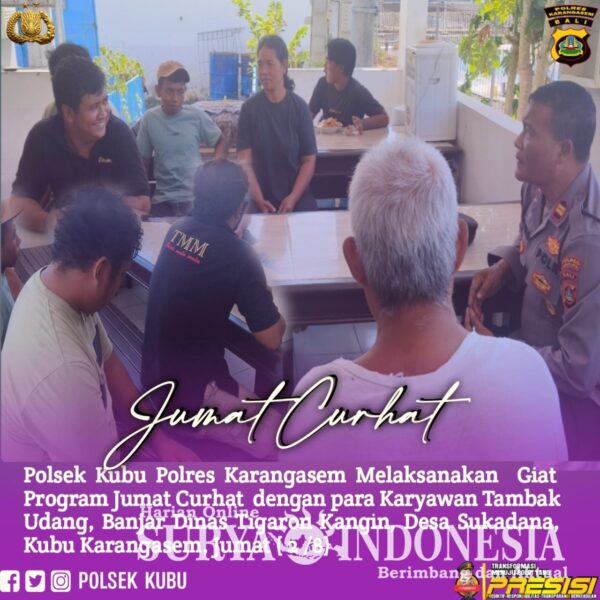 Hari ini Waka Polsek Kubu Iptu I Wayan Sutanaya bersama anggota melaksanakan giat jumat curhat dengan karyawan Tambak Udang Tri Mitra Makmur bertempat di lingkungan Banjar Dinas Tigaron Kangin Desa Sukadana Kubu Karangasem, Jumat (2/8)