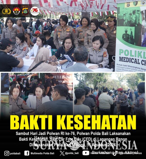 Denpasar , Surya Indonesia.net – Sambut Hari Jadi Polwan RI ke-76, Polwan Polda Bali Bersama Bid Dokkes Polda Bali & Rumkit Bhayangkara Denpasar Laksanakan Bakti Kesehatan Hari Jadi Polwan setiap tahunnya diperingati setiap tanggal 1 September. Tahun ini adalah Hari Jadi ke-76 Polwan (Polisi Wanita) Republik Indonesia. Hari Jadi Polwan tahun ini jatuh pada hari Minggu, 1 September 2024. Dengan mengusung tema “Polwan Presisi Mendukung Percepatan Transformasi Ekonomi yang Inklusif dan Berkelanjutan Menuju Indonesia Emas.”