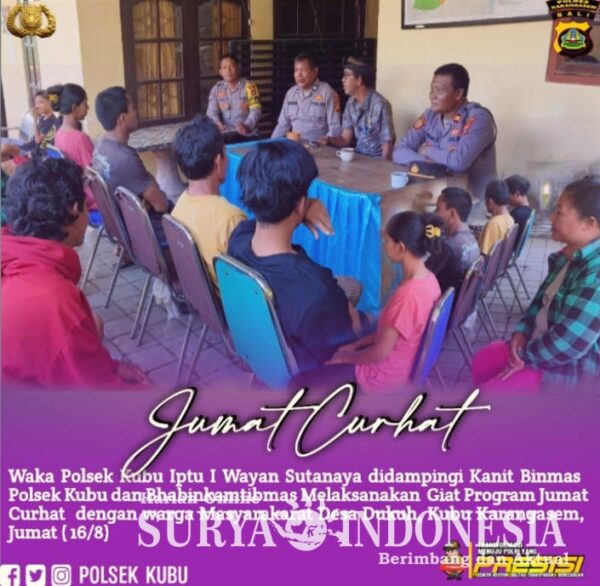 Karangasem , Surya Indonesia.net – Polres Karangasem, Polsek Kubu, diwakili Waka Polsek Kubu Iptu I Wayan Sutanaya didampingi Kanit Binmas Polsek Kubu Aiptu I Made Sukerata dan Bhabinkamtibmas Desa Dukuh kembali melaksanakan program Jumat Curhat guna mendengar secara langsung masukan,saran dan keluhan masyarakat terkait pelayanan kepolisian, Jumat (16/8)