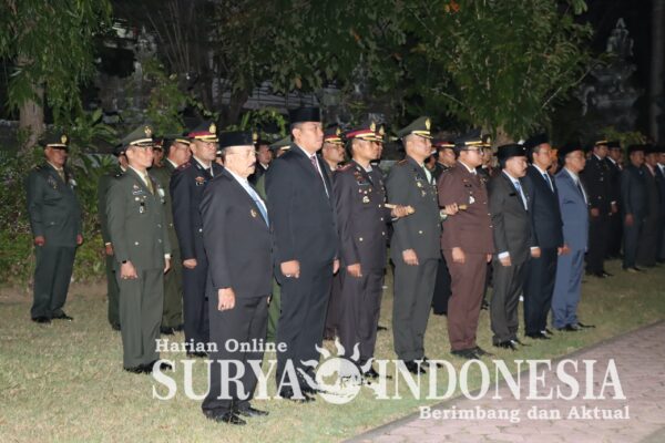Upacara yang berlangsung pada malam hari ini memberikan nuansa tersendiri, menciptakan suasana hening dan penuh makna. Para peserta upacara, termasuk jajaran Polres Karangasem, tampak khusyuk mengikuti setiap rangkaian acara.