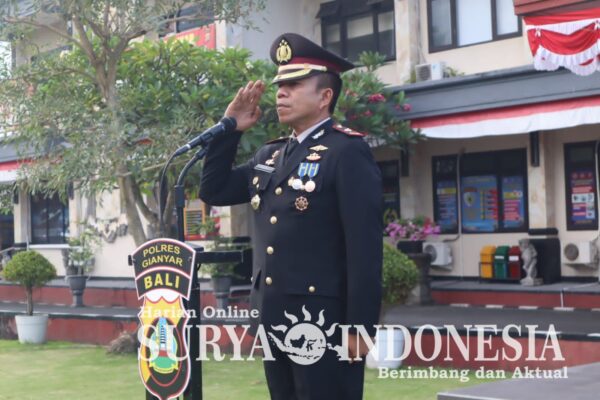Bertindak selaku Inspektur Upacara Waka Polres Gianyar Kompol Yusak Agustinus Sooai, S.I.K. dan diikuti oleh pejabat utama serta personil Polres Gianyar