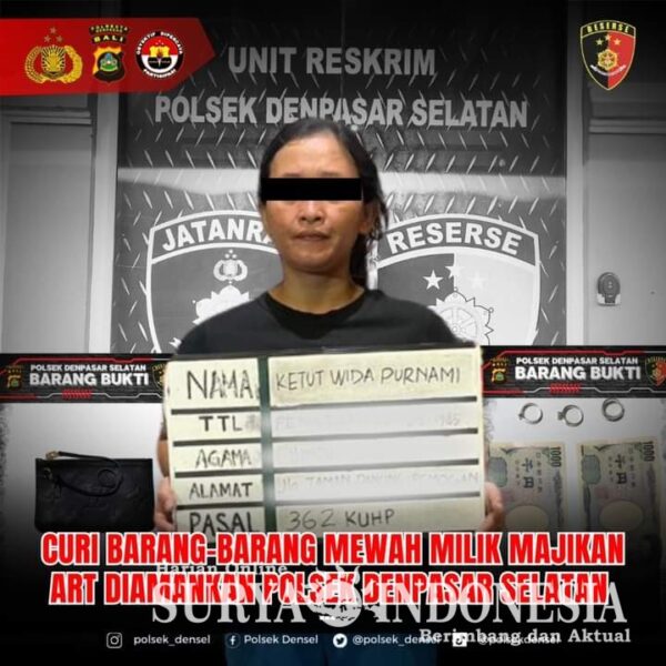 Denpasar , Surya Indonesia.net – Unit Reskrim Polsek Denpasar Selatan mengamankan Seorang ibu yang bekerja sebagai pembantu rumah tangga Ketut Wida Purnami, (39) pada Selasa (13/8) karena melakukan pencurian barang milik majikannya, Penangkapan tersebut setelah polisi menerima laporkan dari Rio Christian, 42 yang tak lain adalah majikannya.