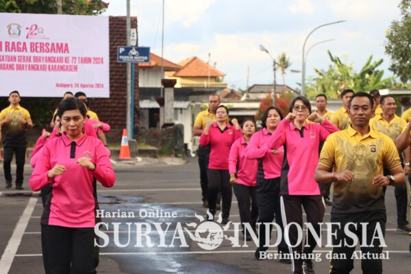 Karangasem , Surya Indonesia.net – Kapolres Karangasem, AKBP I Nengah Sadiarta, S.I.K., S.H., M.K.P., bersama Ketua Bhayangkari Cabang Karangasem, Ny. Wira Nengah Sadiarta, memimpin kegiatan olahraga bersama dalam rangka memperingati dua momen penting. Acara ini diselenggarakan untuk merayakan Hari Jadi Polwan ke-76 Polres Karangasem dan Hari Kesatuan Gerak Bhayangkari (HKGB) ke-72 Tahun 2024.