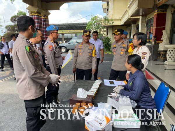 Mangupura , Surya Indonesia.net – Dalam upaya memerangi penyalahgunaan terhadap obat-obatan terlarang maupun Narkoba dilingkungan Polri, Polres Badung melakukan pemeriksaan terhadap puluhan personelnya sesaat setelah pelaksanaan apel pagi di Lobby Polres Badung Jl. Kebo Iwa No. 1 Mengwitani Kecamatan Mengwi Kabupaten Badung, Senin (9/9) pagi.