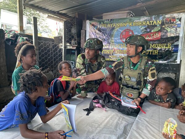 PUNCAK, PAPUA TENGAH , Surya Indonesia.net – Ksatria Buaya Putih TK Kotis Satgas Mobile Yonif 323 Buaya Putih membagikan tas sekolah dan Alat Tulis untuk anak-anak Kampung Kago, Distrik Ilaga, Kabupaten Puncak, Papua Tengah, Selasa (17/09/2024).