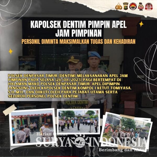 Denpasar , Surya indonesia.net –  Polsek Denpasar Timur (Dentim) melaksanakan Apel Jam Pimpinan pada Selasa (26/08/2025) pagi bertempat di halaman Mako Polsek Denpasar Timur. Apel dipimpin langsung oleh Kapolsek Dentim Kompol I Ketut Tomiyasa, S.H.,M.H., dan diikuti oleh para pejabat utama serta seluruh personel Polsek Dentim.