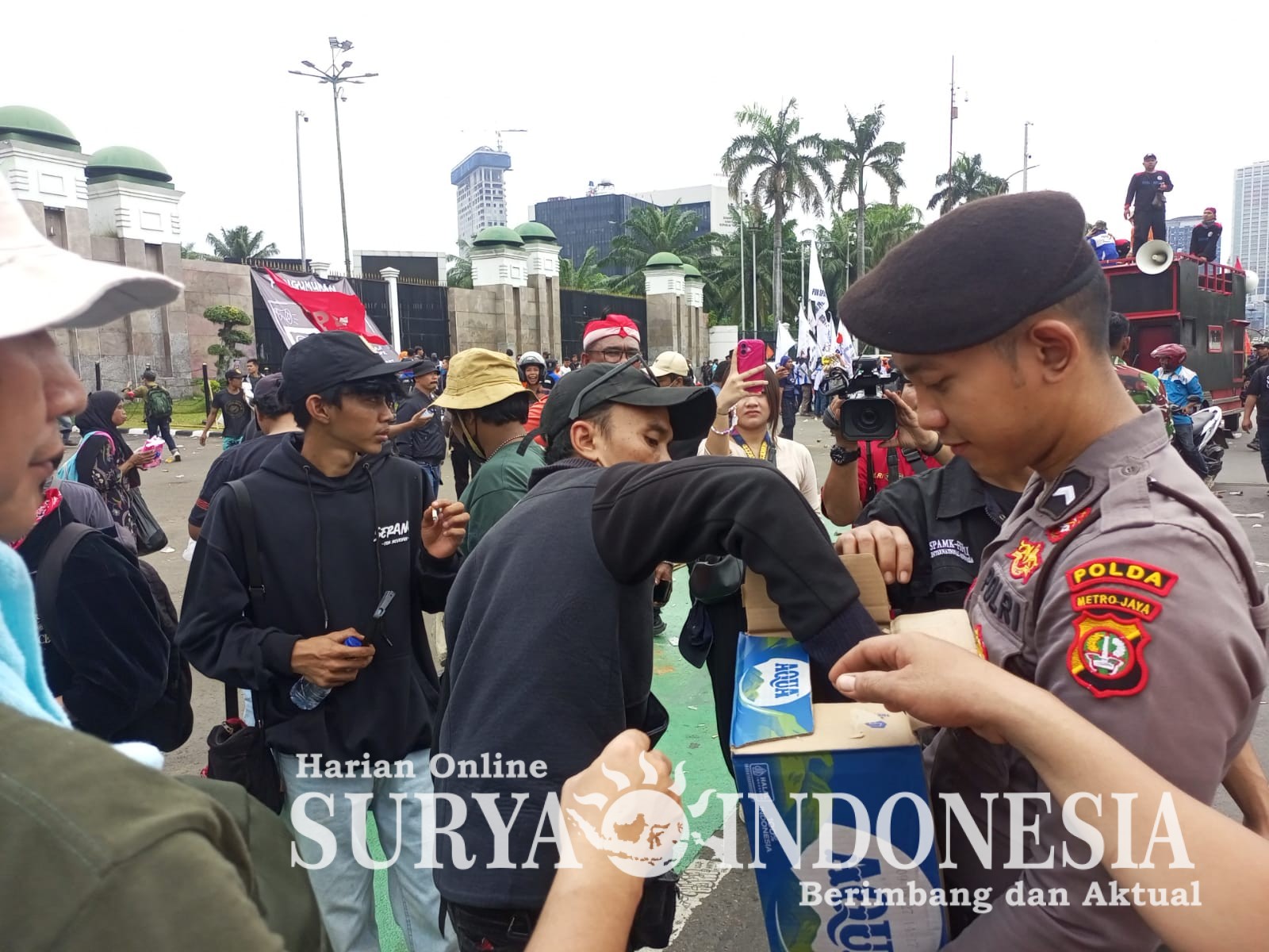 Jakarta Surya indonesia.net – Di sela-sela pengamanan aksi unjuk rasa elemen buruh di depan Gedung DPR/MPR RI, Kamis (28/8/2025), personel Samapta Polda Metro Jaya melakukan aksi simpatik dengan membagikan air mineral dan roti kepada para peserta aksi.