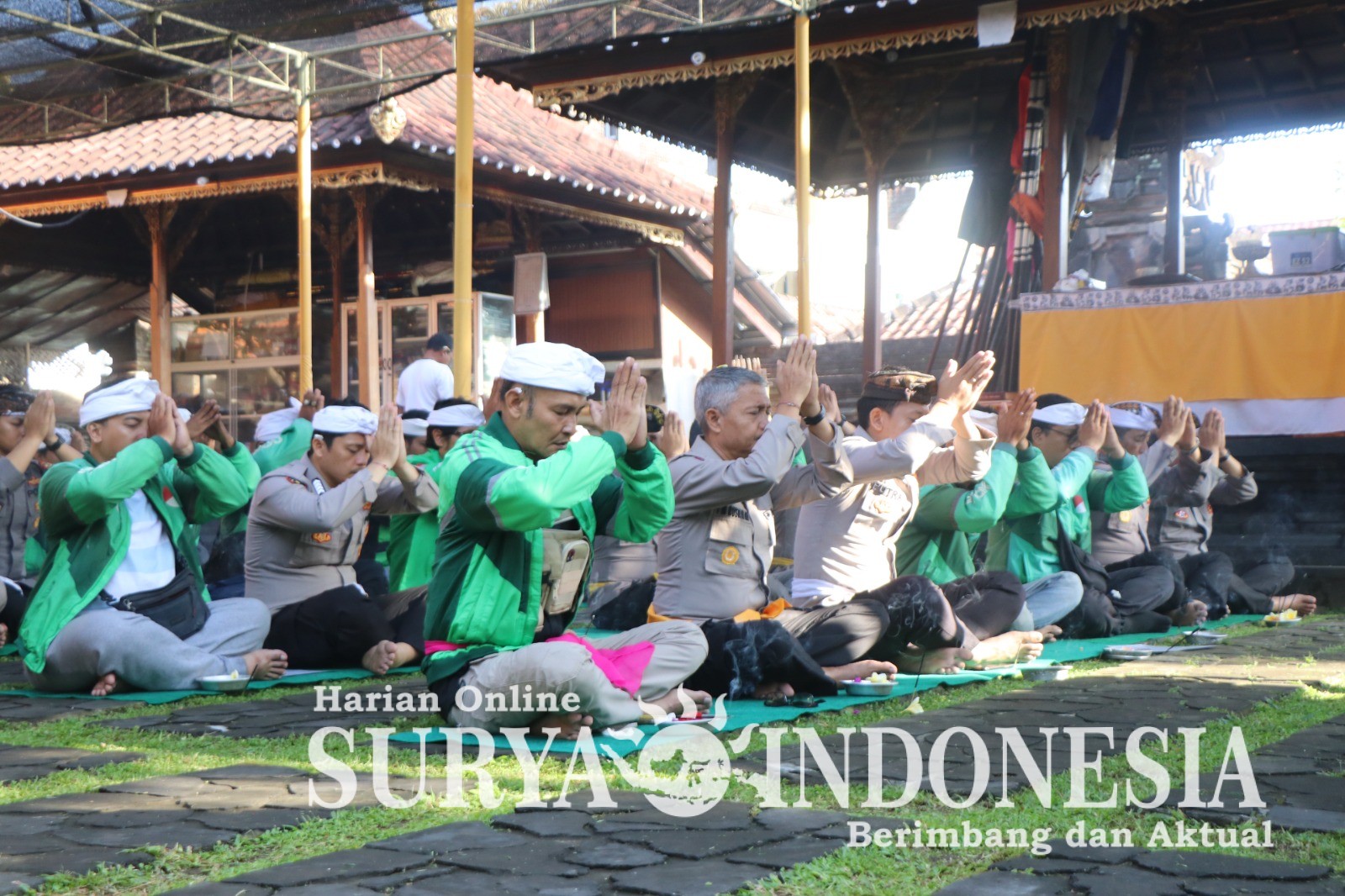 Sebagai bentuk kepedulian, personel Polri bersama para driver ojol yang beragama hindu menggelar doa bersama di Pura Linggarcana Polda Bali, Selasa (2/9/2025).