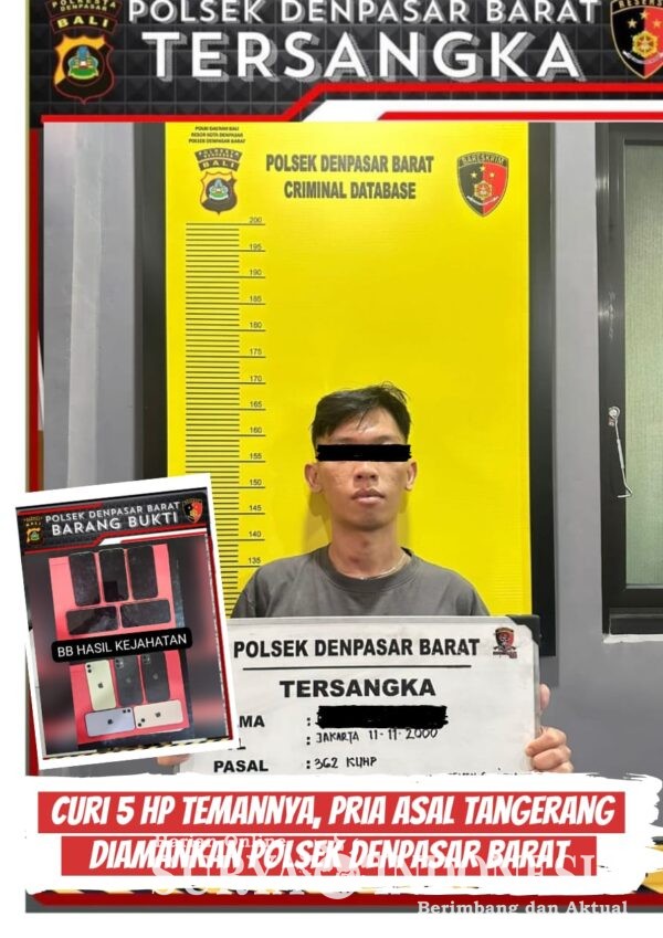 Denpasar,Surya indonesia.net – Unit Reskrim Polsek Denpasar Barat berhasil mengungkap kasus pencurian yang terjadi di Apartemen Ganidha, Jalan Gunung Soputan, Desa Pemecutan Kelod, Denpasar Barat. Pengungkapan ini dilakukan setelah adanya laporan dari korban, Dion (23), asal Medan, yang mengalami kerugian hingga Rp 25 juta akibat kehilangan lima unit handphone.