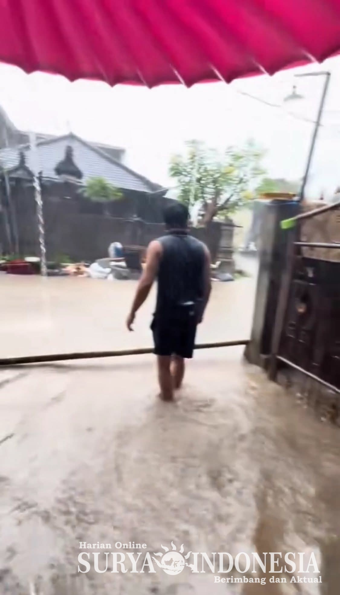 Dalam sebuah unggahan di media sosial, akun @mbok_tut memperlihatkan kondisi terkini di lokasi. Video tersebut menampilkan air yang meluap hingga ke halaman rumah warga, dengan arus cukup deras di selokan sekitar jalan.