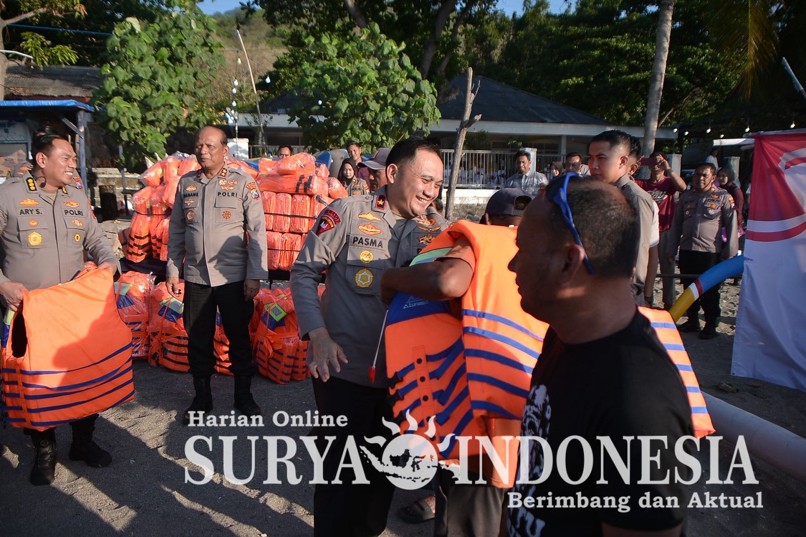 Kapolda Jatim juga memberikan rompi pelampung untuk keamanan serta bingkisan sembako untuk para nelayan.