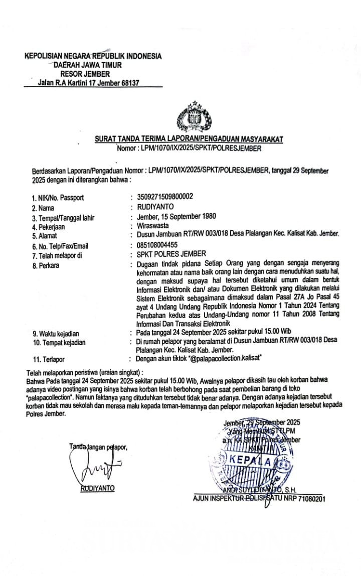 JEMBER, suryaindonesia.net, – Rudiyanto, ayah kandung MS (16), siswi salah satu SMK di Kabupaten Jember, melaporkan sebuah video TikTok ke Kepolisian Resor Jember pada Senin, 29 September 2025. Laporan itu terregister nomor LPM/1070/IX/2025/SPKT/Polres Jember.