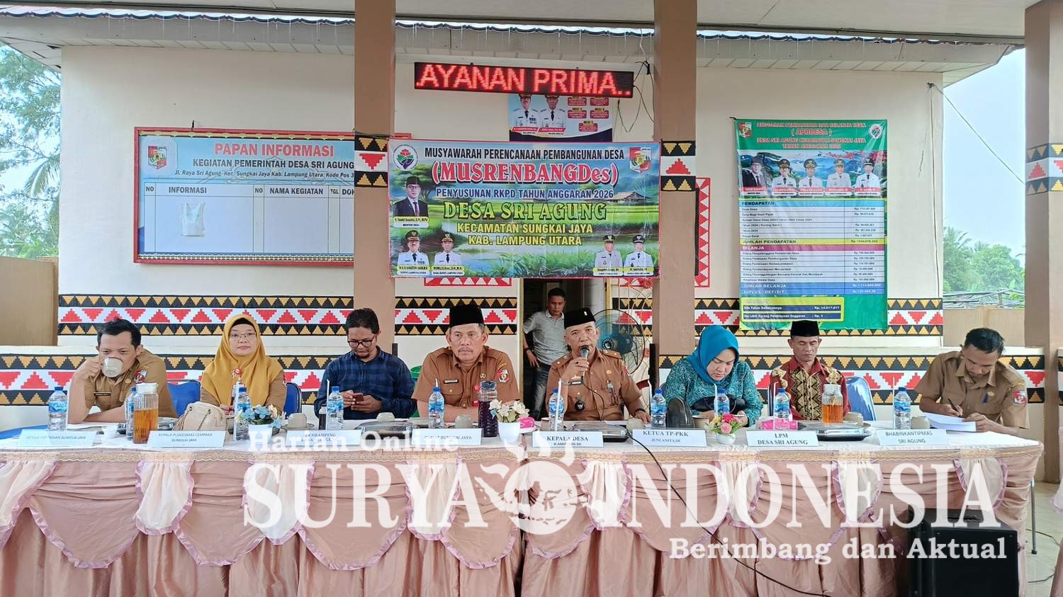 Lampung Utara – Surya indonesia.net – Pemerintah Desa Sri Agung melaksanakan Musyawarah Perencanaan Pembangunan Desa (MUSRENBANGDES) dalam rangka penyusunan Rencana Kerja Pemerintah Desa (RKPD) Tahun Anggaran 2026. Kegiatan ini berlangsung di Aula Kantor Desa Sri Agung, Kecamatan Sungkai Jaya, Kabupaten Lampung Utara, Senin (6/10/2025).