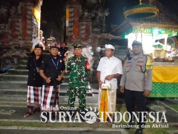 Gianyar,Surya indonesia.net – Personel Polsek Gianyar bersama Babinsa dan Pecalang Desa Adat Suwat melaksanakan pengamanan kegiatan Upacara Penyineban di Pura Dalem Lan Prajapati, Desa Adat Suwat, Kecamatan Gianyar, Jumat (10/10) malam.