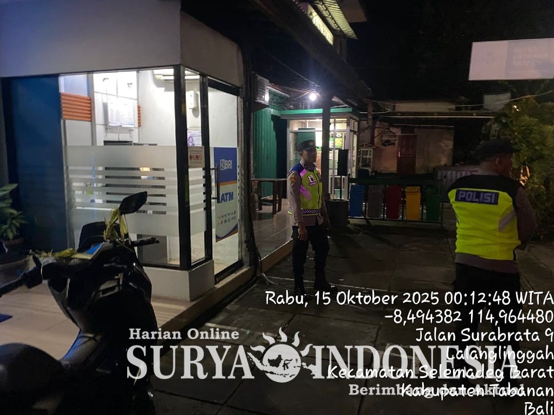 Tabanan, Surya indonesia.net -Polsek Selbar Suraberata, Rabu 15/10/2025 Pukul 21.00 s/d 23.00 wita Dalam rangka menciptakan situasi aman dan kondusif di wilayah Kecamatan Selemadeg barat Personil Polsek Selemadeg barat Polres Tabanan dipimpin Pawas AIPDA I Putu Hery Nata Saputra S.H optimalkan Kegiatan Patroli “Blue light” guna menekan ruang potensi gangguan Kamtibmas pada malam hari.