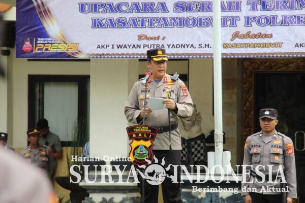 Tabanan, Surya indonesia.net –  Bertempat di Lapangan Apel Polres Tabanan, Rabu (15/10/2025) pukul 10.00 Wita, telah dilaksanakan Upacara Serah Terima Jabatan (Sertijab) Kasat Pamobvit Polres Tabanan berdasarkan Surat Telegram Kapolda Bali Nomor: ST/1587/X/KEP./2025 dan Surat Perintah Kapolres Tabanan Nomor: Sprin/1692/X/KEP./2025. Upacara ini dipimpin langsung oleh Kapolres Tabanan AKBP I Putu Bayu Pati, S.I.K., M.H. selaku Inspektur Upacara (Irup), dengan perangkat upacara terdiri dari pejabat utama Polres Tabanan.