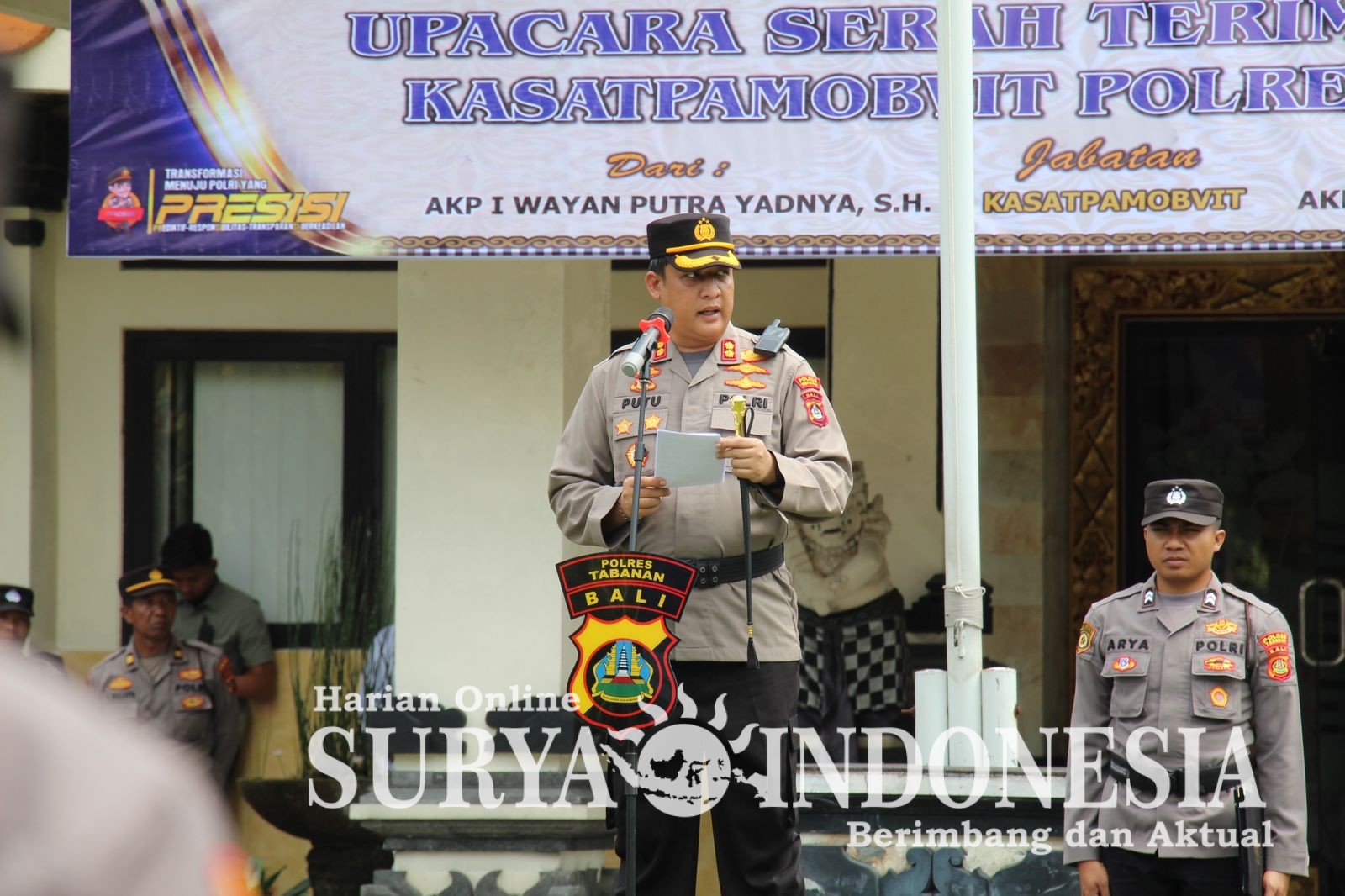 Tabanan, Surya indonesia.net – Bertempat di Lapangan Apel Polres Tabanan, Rabu (15/10/2025) pukul 10.00 Wita, telah dilaksanakan Upacara Serah Terima Jabatan (Sertijab) Kasat Pamobvit Polres Tabanan berdasarkan Surat Telegram Kapolda Bali Nomor: ST/1587/X/KEP./2025 dan Surat Perintah Kapolres Tabanan Nomor: Sprin/1692/X/KEP./2025. Upacara ini dipimpin langsung oleh Kapolres Tabanan AKBP I Putu Bayu Pati, S.I.K., M.H. selaku Inspektur Upacara (Irup), dengan perangkat upacara terdiri dari pejabat utama Polres Tabanan.