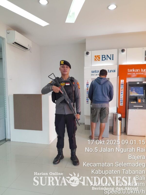 Tabanan, Surya indonesia.net –  Satuan Pengamanan Obyek Vital (Sat Pamobvit) Polres Tabanan melaksanakan kegiatan pengamanan di sejumlah perbankan yang ada di wilayah hukum Polres Tabanan pada Jumat (17/10/2025). Kegiatan ini berlangsung sejak pukul 08.00 hingga 17.00 Wita, menyasar beberapa lokasi strategis yakni Bank BRI, BPD, BNI, dan BCA di wilayah Tabanan, Kediri, Baturiti, dan Bajera. Pengamanan dipimpin langsung oleh Kasat Pamobvit Polres Tabanan AKP I Wayan Sudiarba berdasarkan Surat Perintah Kapolres Tabanan Nomor: Sprin/1601/IX/PAM.3./2025 tanggal 23 September 2025.