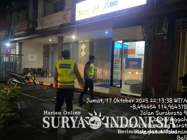 Tabanan, Surya indonesia.net – Polsek Selbar Suraberata, Sabtu 18/10/2025 Pukul 21.00 s/d 23.00 wita Dalam rangka menciptakan situasi aman dan kondusif di wilayah Kecamatan Selemadeg barat Personil Polsek Selemadeg barat Polres Tabanan dipimpin Pawas AIPDA I Putu Hery Nata Saputra S.H optimalkan Kegiatan Patroli “Blue light” guna menekan ruang potensi gangguan Kamtibmas pada malam hari.