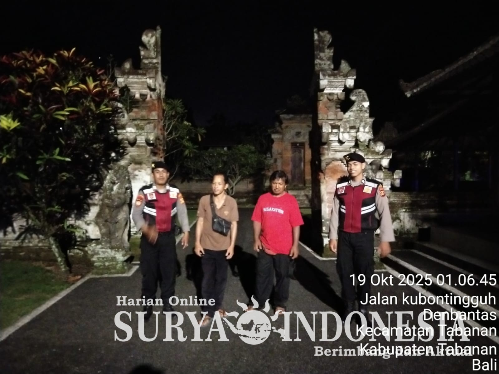 Tabanan, Surya indonesia.net – Dalam rangka menjaga keamanan dan ketertiban masyarakat di waktu rawan, Sat Samapta Polres Tabanan melaksanakan kegiatan Patroli Jalan Kaki Subuh Keliling Perintis Presisi pada Minggu (19/10/2025) dini hari. Kegiatan dimulai pukul 01.00 hingga 02.30 WITA, dipimpin oleh PS. Kasubnit 2 Dalmas, Bripka I Wayan Rangga Dita Diputra, bersama dua personel lainnya yaitu Briptu Made Gandhi Yoga Mahotama dan Bripda Pande Putu Gede Bashu Dewa. Patroli ini merupakan upaya preventif dalam mencegah potensi terjadinya ambang gangguan kamtibmas di wilayah hukum Polres Tabanan.