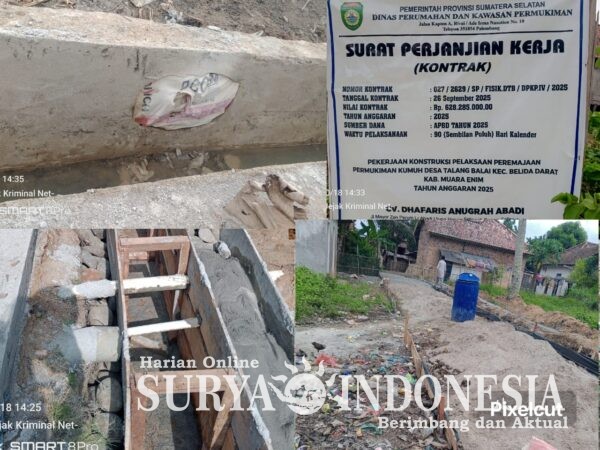Desa Talang Balai, Kecamatan Belido Darat, Kabupaten Muara Enim, Sumatera Selatan – Pembangunan jalan setapak dan siring di Desa Talang Balai yang dikerjakan oleh CV. Dhafaris Anugrah Abadi dengan nilai kontrak sebesar Rp628.285.000 menuai keluhan dari warga setempat. Pasalnya, kualitas pembangunan tersebut dipertanyakan.