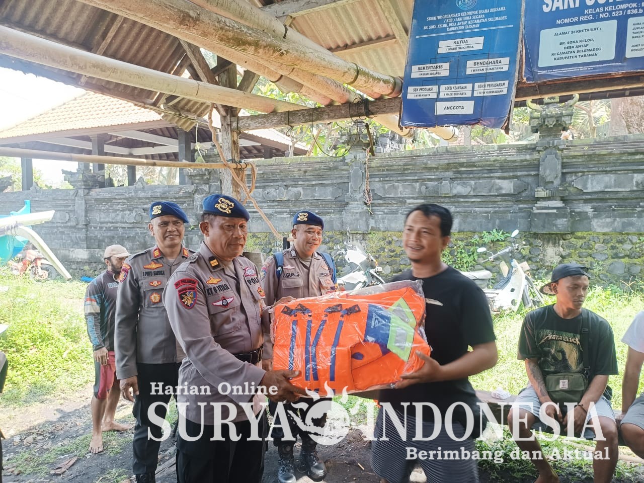 Tabanan.Surya indonesia.net – Dalam rangka mempererat kemitraan antara Polri dan masyarakat pesisir, Satuan Polisi Perairan dan Udara (Satpolairud) Polres Tabanan bersama Ditpolairud Polda Bali melaksanakan kegiatan penyerahan sarana kontak berupa life jacket kepada kelompok nelayan di Pantai Soka, Selasa (21/10/2025) pukul 11.00 Wita. Kegiatan ini dipimpin oleh Kasatpolairud Polres Tabanan AKP I Putu Sartika, S.H., M.H., dengan dukungan personel dari Satpolairud Polres Tabanan dan Ditpolairud Polda Bali.