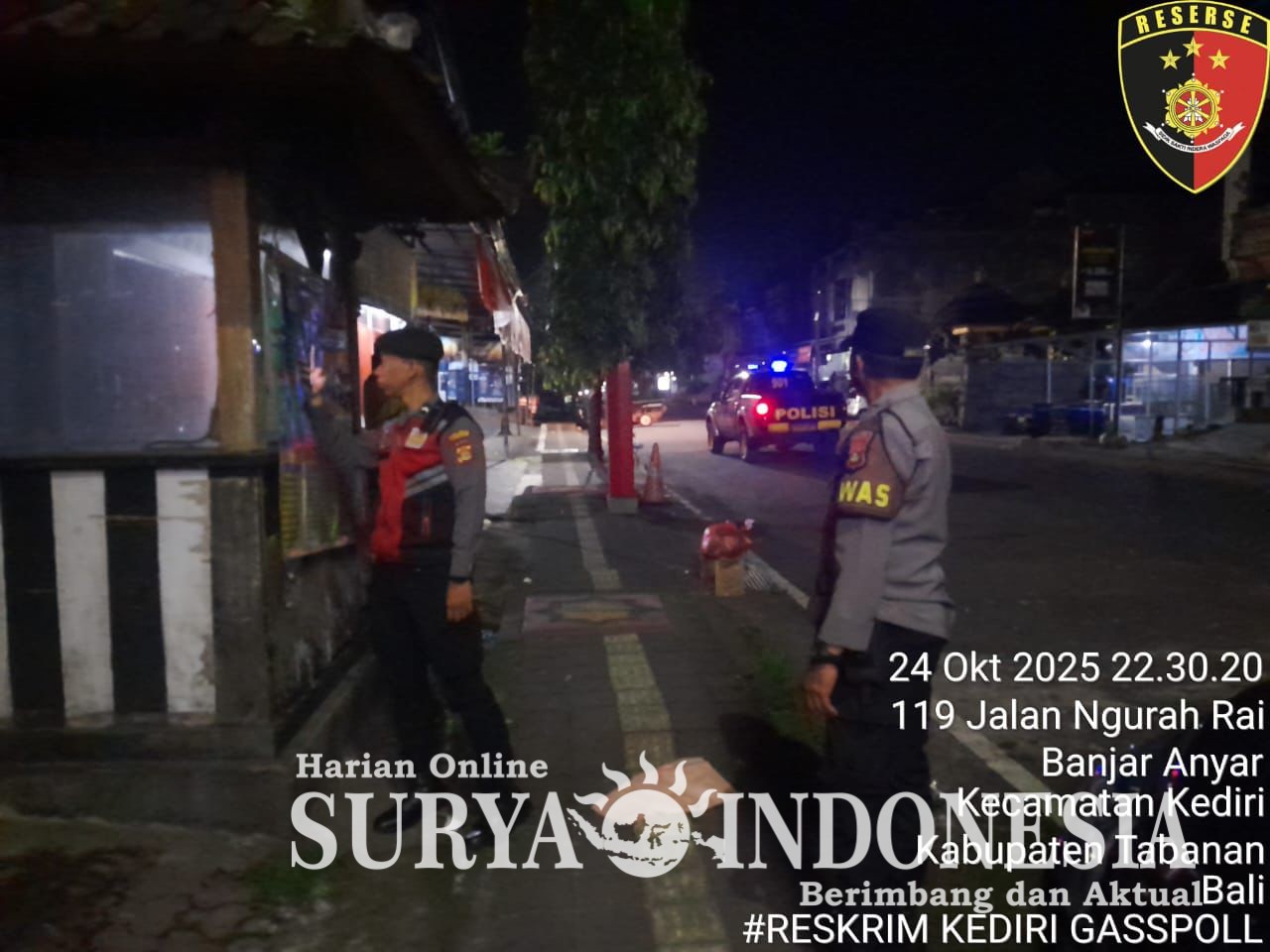 Tabanan, Surya indonesia.net – Polsek Kediri melaksanakan ‘Patroli Barcode’ di seputaran wilayah Kediri Jumat (24/10/2025 ) pukul 21.00 s/d 23.00 wita dalam rangka menciptakan situasi Kamtibmas yang aman dan kondusif.