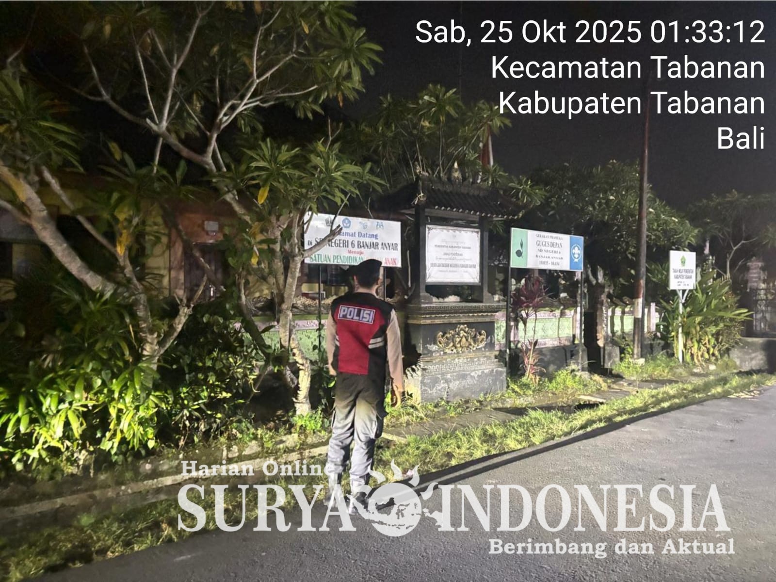 Tabanan, Surya indonesia.net – Dalam upaya menjaga situasi kamtibmas agar tetap aman dan kondusif, personel Satuan Samapta Polres Tabanan melaksanakan Patroli Jalan Kaki Subuh Keliling Perintis Presisi pada Sabtu (25/10/2025) dini hari. Kegiatan patroli yang berlangsung dari pukul 01.00 hingga 02.30 WITA ini dipimpin oleh PS. Kasubnit 2 Dalmas, Bripka I Wayan Rangga Dita Diputra, dengan melibatkan dua personel, yaitu Briptu Made Gandhi Yoga Mahotama dan Bripda Komang Ari Wardana Saputra.