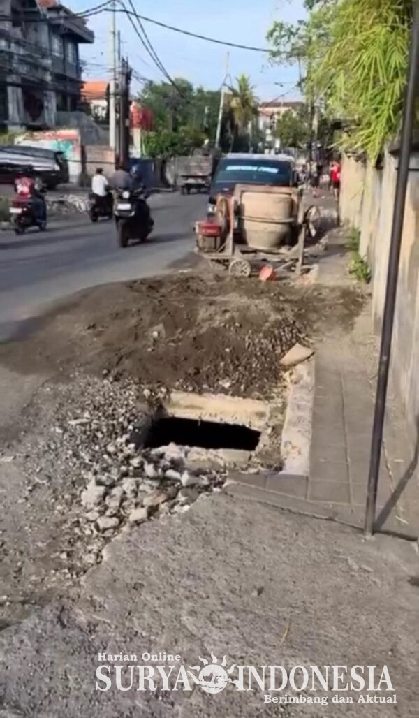 Denpasar , Surya indonesia.net – Proyek Tak Kunjung Rampung di Kerobokan Kelod, Trotoar Terbuka dan Kabel Kendor mengganggu Pengguna Jalan