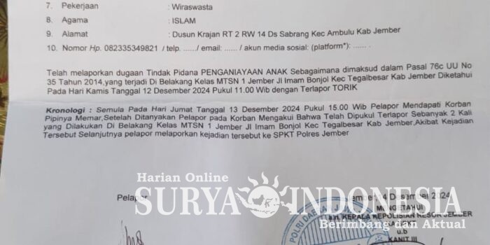 Jember, suryaindonesia.net,- Salah satu siswa ( RZ) di Madrasah Tsanawiyah Negeri ternama di Jember, menjadi korban bullying yang dilakukan oleh 4 temannya, dimana pelaku utama dari aksi ini diduga dilakukan oleh temannya yang masih anak dari guru yang mengajar di sekolah tersebut.