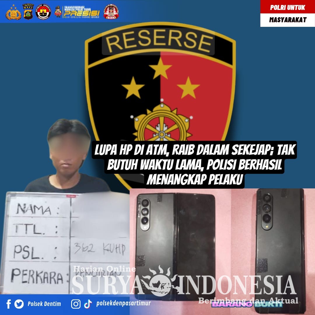 Denpasar, Surya indonesia.net – Unit Reskrim Polsek Denpasar Timur (Dentim) berhasil mengungkap kasus pencurian handphone yang berawal dari kelalaian seorang warga yang meninggalkan ponselnya di mesin ATM. Berkat kerja cepat dan sigap, pelaku berhasil diamankan beserta barang bukti hasil kejahatannya.