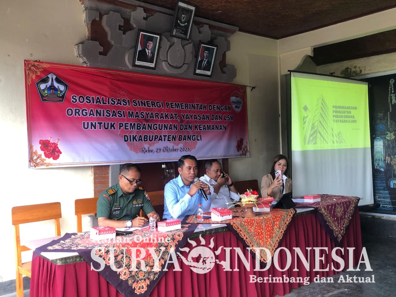 Bangli, suryaindonesia.net – 29 Oktober 2025 – Kapolres Bangli diwakili oleh Kasat Intelkam, IPTU I Ketut Sumertha, S.H., M.H., memberikan sosialisasi sinergi pemerintah dengan Organisasi Kemasyarakatan (Ormas), Yayasan, dan Lembaga Swadaya Masyarakat (LSM) untuk pembangunan dan keamanan di Kabupaten Bangli. Kegiatan ini berlangsung di Balai Pertemuan Kantor Lurah Bebalang dan dihadiri oleh berbagai pihak, termasuk Sekban Kesbangpol Kabupaten Bangli, Pasi Inteldim 1626/Bangli, dan perwakilan pimpinan Ormas, Yayasan, dan LSM.