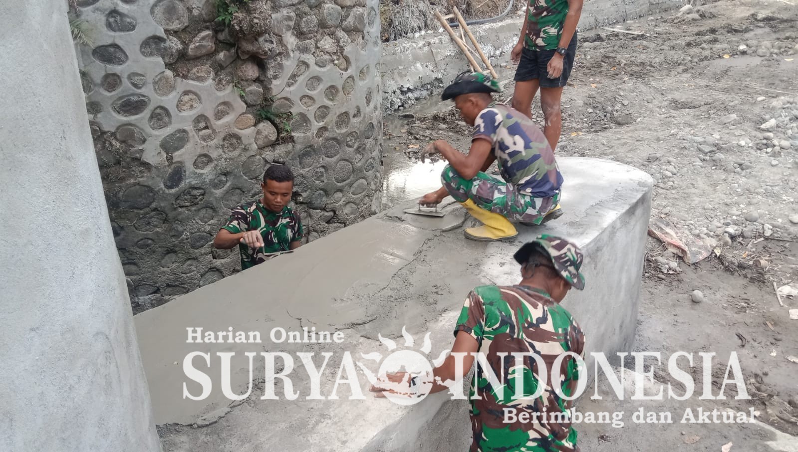 Salah satu pekerjaan utama yang tengah diselesaikan Satgas TMMD adalah plester pintu bendungan, yang menjadi bagian penting dalam mendukung fungsi irigasi bagi lahan pertanian warga. Pekerjaan ini dilakukan secara gotong royong antara personel Satgas TMMD dan masyarakat setempat.