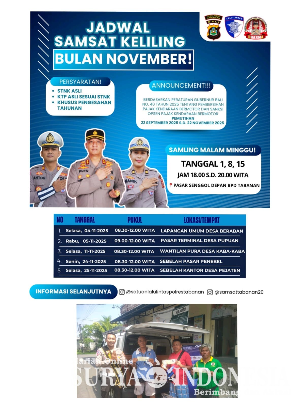 Tabanan, Surya indonesia.net – Sebagai wujud peningkatan akses pelayanan publik, Satlantas Polres Tabanan kembali menghadirkan layanan Samsat Keliling (Samling) untuk bulan November 2025. Program ini bertujuan mempermudah masyarakat dalam melakukan perpanjangan STNK tahunan dan pengesahan pajak kendaraan bermotor tanpa harus datang ke Kantor Samsat. Berikut jadwal pelaksanaan layanan Samling: