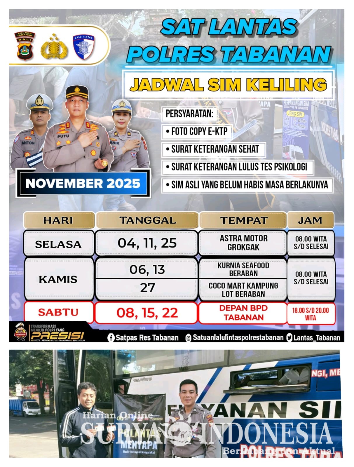 Adapun jadwal pelayanan SIM Keliling di wilayah Tabanan pada bulan November 2025 adalah sebagai berikut: