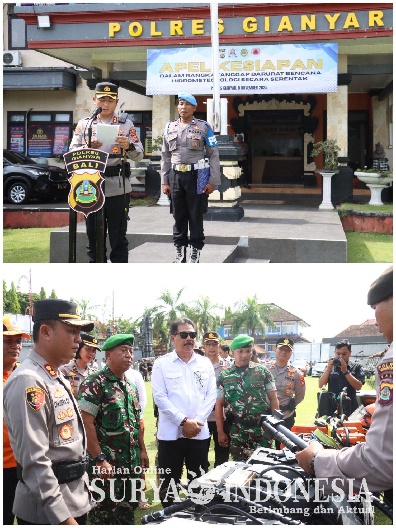 Gianyar , Surya indonesia.net – Dalam rangka menghadapi potensi bencana hidrometeorologi pada musim hujan, Polres Gianyar menggelar Apel Kesiapan Pasukan dan Peralatan Tanggap Darurat Bencana yang dipimpin langsung oleh Kapolres Gianyar AKBP Chandra C. Kesuma, S.I.K., M.H., bertempat di Lapangan Apel Tri Brata Polres Gianyar, Rabu (5/11/2025).